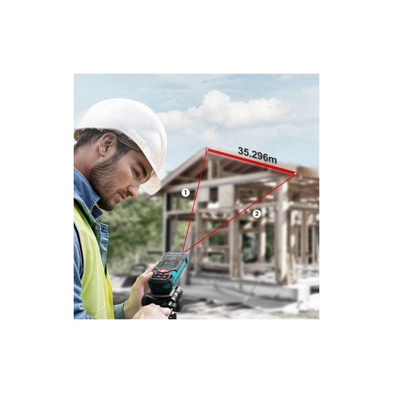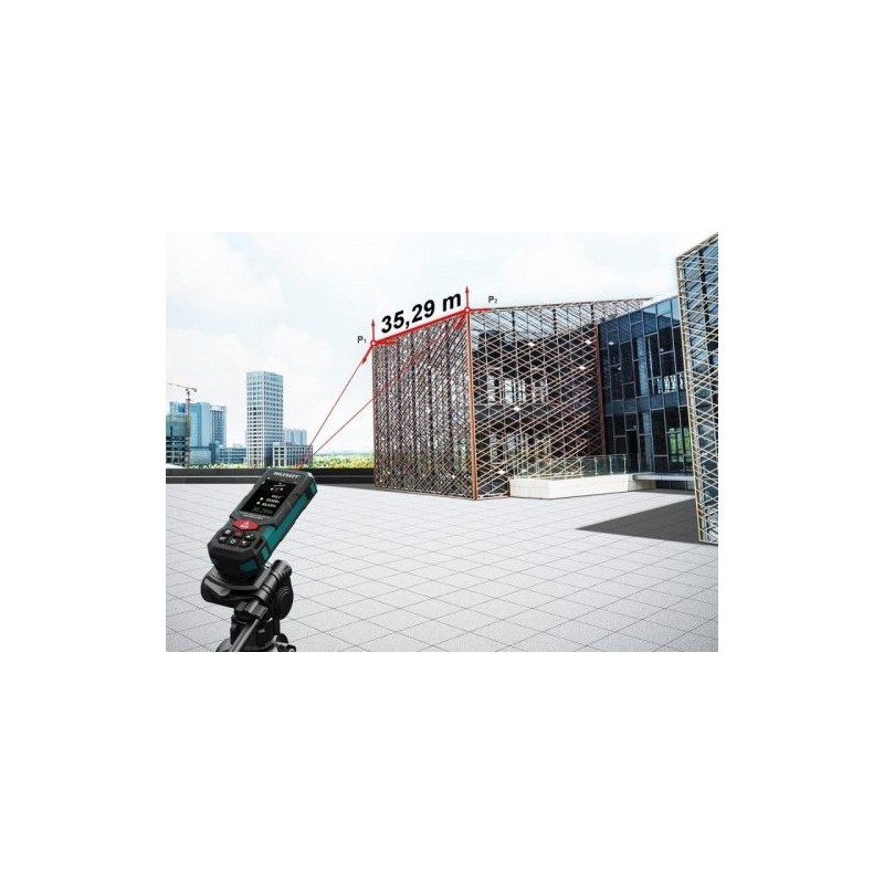 - Specjalne funkcje pomiarowe: pole trójkąta / pole trapezu / objętość walca / poziom automatyczny / wysokość automatyczna / wytyczanie