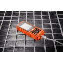 NEO dalmierz laserowy to urządzenie kompaktowe niewielkich rozmiarów i przede wszystkim poręczne, do tego wykonane z dbałością o szczegóły i niezwykle wysokiej jakości. Jego wymiary to zaledwie 14,40 × 5,00 × 18,20 cm (szerokość x wysokość x długość). Obudowa ABS posiada gumowe elementy, dzięki czemu narzędzie pewnie leży w dłoni i nie wyślizguje się. Podświetlany ekran jest kolorowy, dla bardziej komfortowej pracy ze sprzętem. Pod nim umieszczono przyciski, z pomocą których wybierasz opcje przyrządu.