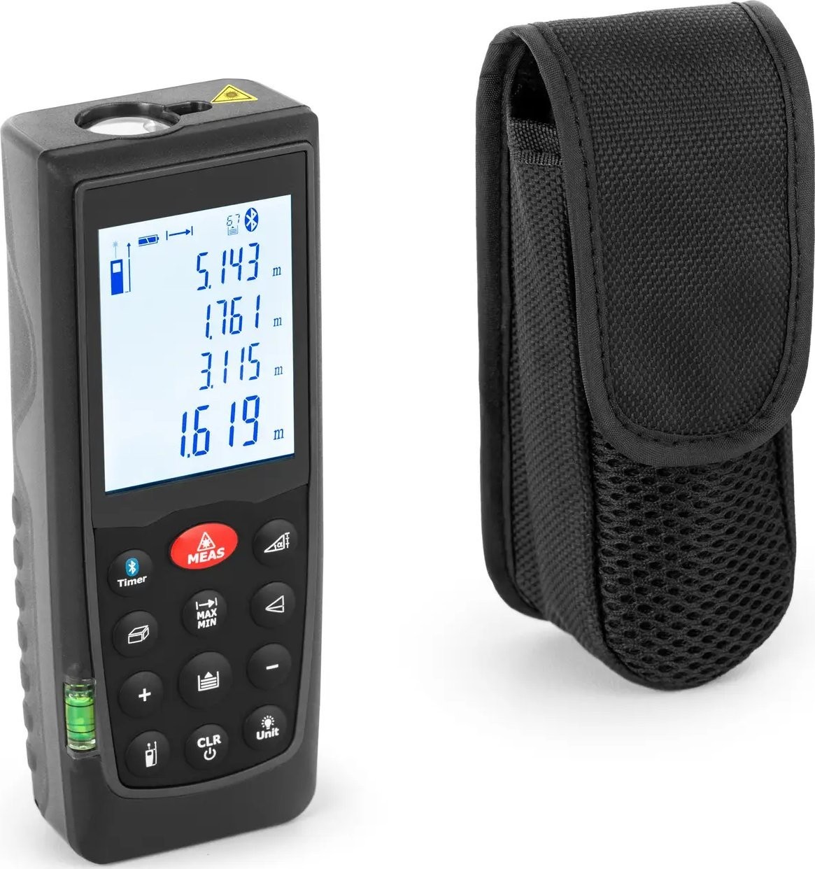 Dalmierz laserowy marki Steinberg Systems jest bardzo dokładny, mały i niezawodny. Miernik odległości znacznie ułatwi i uprości pracę, nie potrzebuje żadnych punktów pomiarowych ani drugiej osoby, aby zapewnić dokładne wyniki. Dzięki zasięgowi 70 m przyrząd do pomiaru odległości sprawdzi się wszędzie tam, gdzie ważna jest dokładność, czy to na placach budowy, w magazynach, czy w domu. Dzięki funkcji timera, wyznaczania i ciągłego pomiaru, a także transmisji danych Bluetooth (iOS), praca z tym modelem będzie niezwykle elastyczna i wygodna. Za pomocą dalmierza można sprawdzić odległości z dokładnością do 1,5 mm w ciągu kilku sekund. Oprócz odległości, to profesjonalne urządzenie zmierzy również kąty (funkcja Pitagorasa), nachylenia do 65°, a także powierzchnie i objętości. Dzięki temu idealnie nada się do obliczania ilości materiałów. Miernik podaje wszystkie wartości i ich odpowiedniki dla powierzchni i kubatury w metrach, calach lub stopach. Urządzenie posiada pamięć na 20 zapisów. Dzięki temu można sprawdzić otrzymane wartości i zmniejszyć ryzyko popełnienia błędów wynikających z ręcznego przesyłania pomiarów. Dalmierz z laserem posiada automatyczną kalibrację. Wyświetla on kąt w czasie rzeczywistym, więc jest szybszy i bardziej precyzyjny niż poziomica. Dzięki niewielkim rozmiarom i zasilaniu bateryjnemu przyrząd do pomiaru odległości jest idealnym urządzeniem nawet w podróży. Posiada stopień ochrony IP54 przed kurzem i bryzgami wody ze wszystkich stron, więc idealnie nada się do stosowania w trudnych warunkach, takich jak place budowy. Za sprawą paska na rękę i miękkiego nylonowego etui można wygodnie zabrać urządzenie ze sobą. Przyrząd posiada laser klasy 2. Emituje on wiązkę tylko w zakresie fal widzialnych i nie powoduje żadnych urazów, jeśli przypadkowo się na niego spojrzy. Dalmierz laserowy wyposażono podświetlany ekran LCD. Umożliwi on bezproblemowy odczyt wartości, nawet w nocy lub w ciemnym otoczeniu.