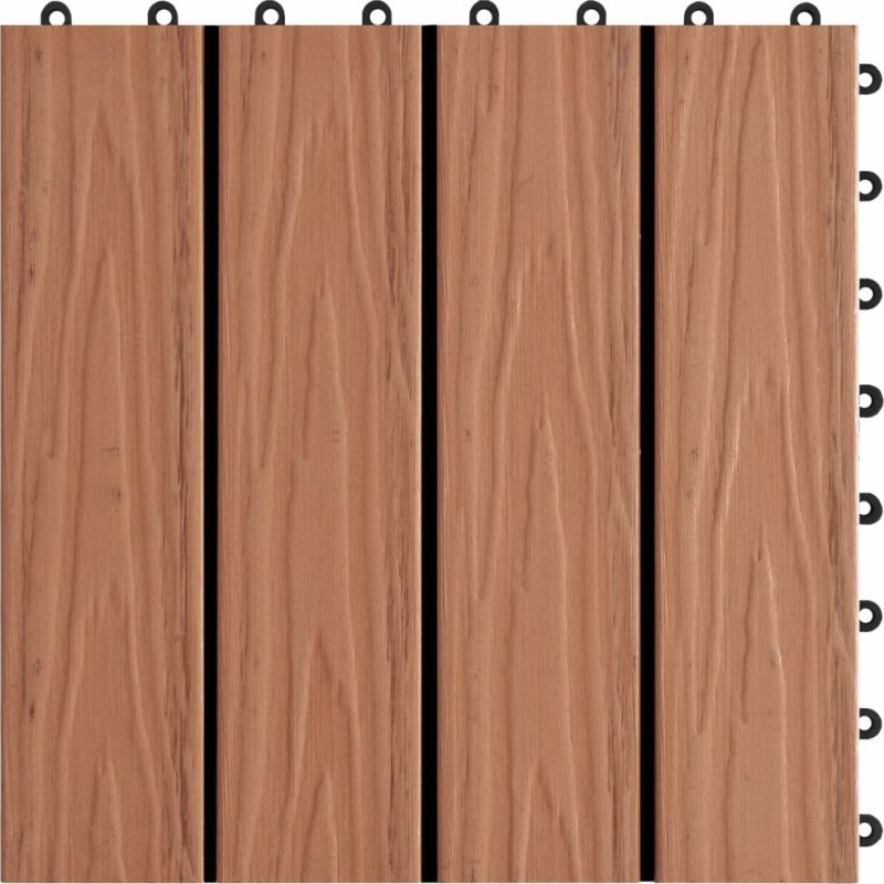 Zestaw składa się z 11 płytek tarasowych z WPC z głębokimi tłoczeniami, z których każda ma wymiary 30 x 30 cm, a razem pozwolą pokryć powierzchnię 1 m. Będzie idealnym wyborem na patio, balkon, do łazienki, terenu wokół basenu i obszaru spa.