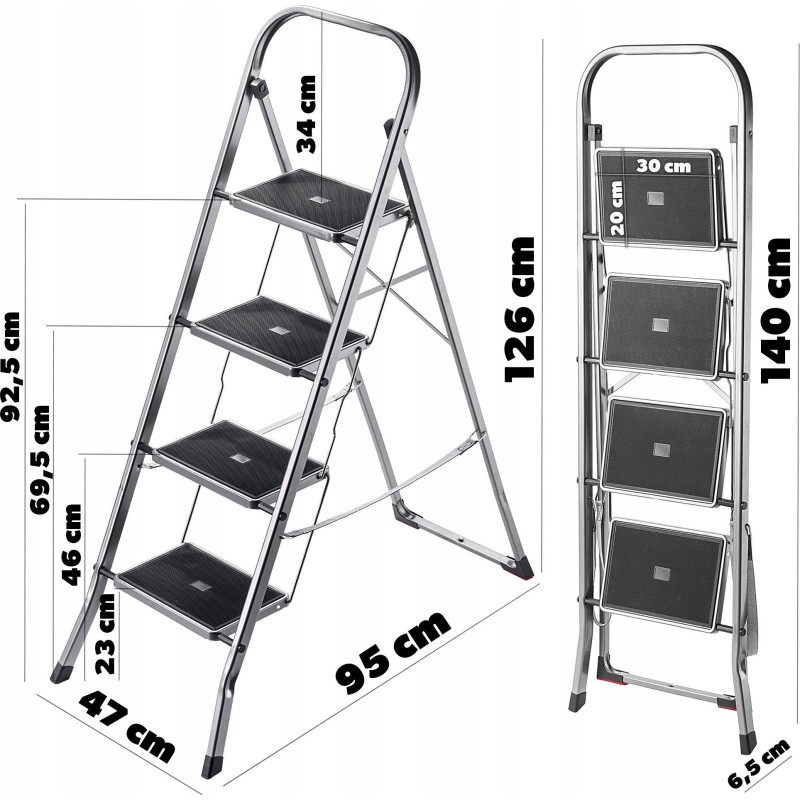 - Wymiary drabiny po rozłożeniu: 47 x 95 x 126 cm