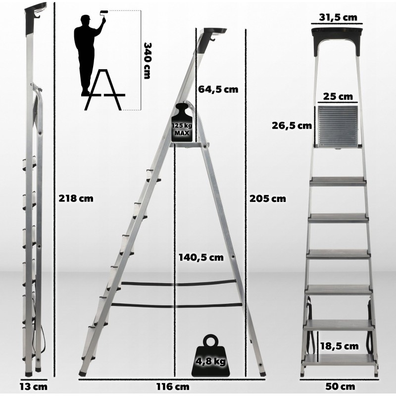- Wymiary drabiny po rozłożeniu: 50 x 116 x 205 cm