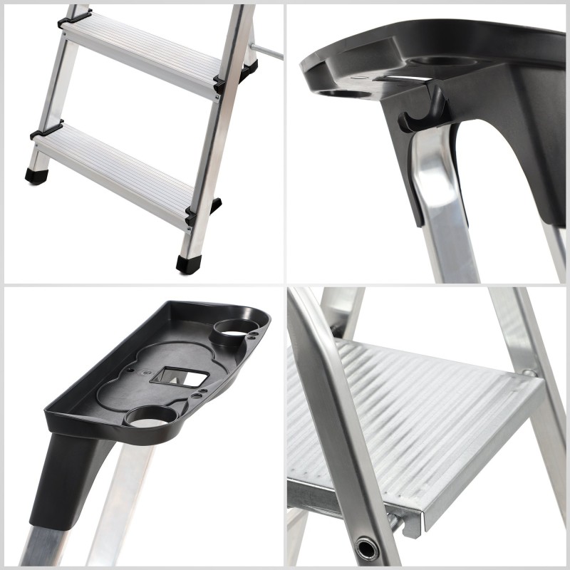 Narzędzie wykonane jest z trwałego i lekkiego aluminium, dlatego nie będziesz mieć problemów z zabieraniem go w podróż. Nasza drabina aluminiowa dzięki kompaktowym rozmiarom łatwo zmieści się w bagażniku samochodowym, garażu lub schowku na narzędzia.