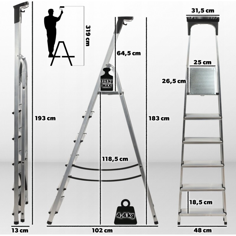 - Wymiary drabiny po rozłożeniu: 48 x 102 x 183 cm