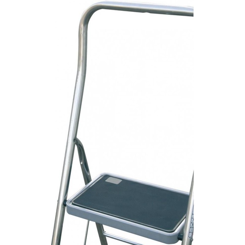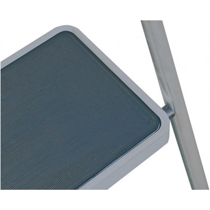 Aluminiowe składane schodki z dużymi stopniami do różnorodnych prac wewnątrz pomieszczeń, zajmujące bardzo mało miejsca po złożeniu. Wysoki pałąk zwiększa bezpieczeństwo (600 mm). Zabezpieczenie przed samoczynnym złożeniem się schodków w czasie użytkowania. Duże, gumowane antypoślizgowe stopnie zapewniają bezpieczeństwo przy pracy.