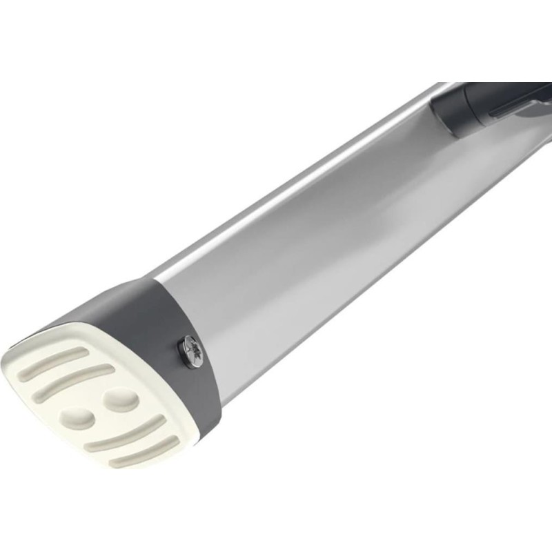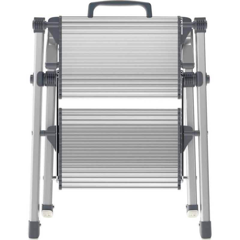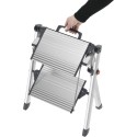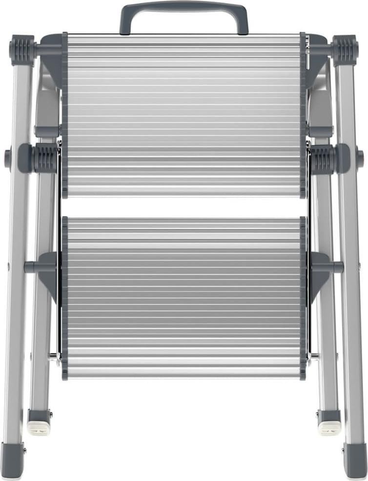 Ta mała i kompaktowa drabina posiada 2 duże stopnie z antypoślizgową powierzchnią i mieści się w każdym rogu. Antypoślizgowe, plastikowe nóżki zapewniają stabilność na różnych powierzchniach, takich jak parkiet, dywan i płytki. Drabina składa się do zaledwie 6,5 cm grubości, co ułatwia przechowywanie, gdy nie jest używana. Jest również bardzo wygodna do przenoszenia dzięki praktycznemu uchwytowi, który steruje również mechanizmem składania.