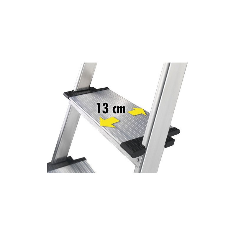 Drabina została wyposażona w aluminiowe stopnie o szerokości 13 cm, co zapewnia stabilność oraz pewność podczas użytkowania. Antypoślizgowa powierzchnia stopni dodatkowo zwiększa bezpieczeństwo, czyniąc ją idealnym wyborem do wszelkich prac domowych.