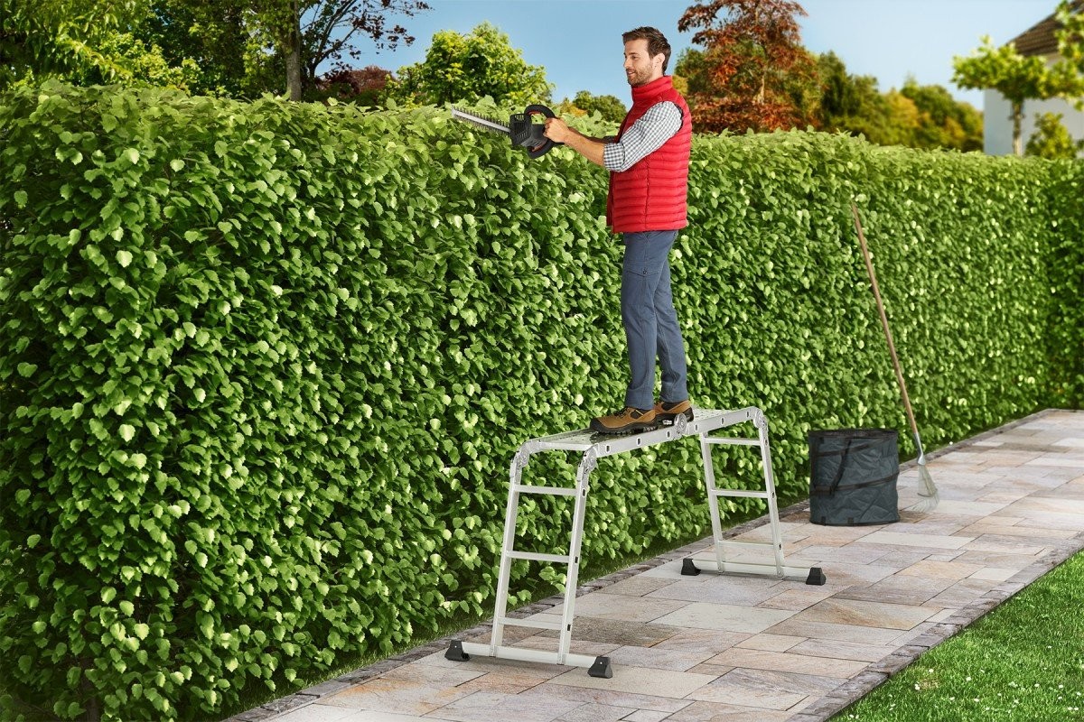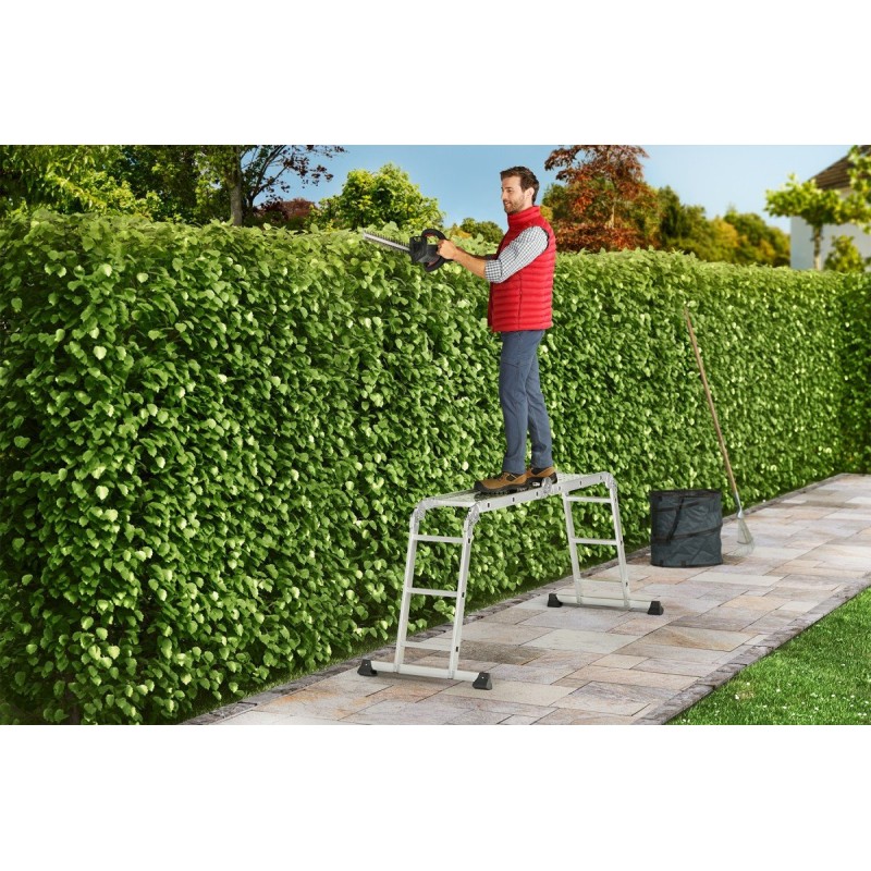 Hailo M60 oferuje możliwość użycia w różnych konfiguracjach, co czyni ją niezwykle funkcjonalną. Można ją ustawić jako drabinę przystawną lub wolnostojącą, co pozwala na dostosowanie jej do indywidualnych potrzeb użytkownika. Dzięki temu, drabina sprawdzi się w wielu sytuacjach, od malowania ścian po prace ogrodowe.