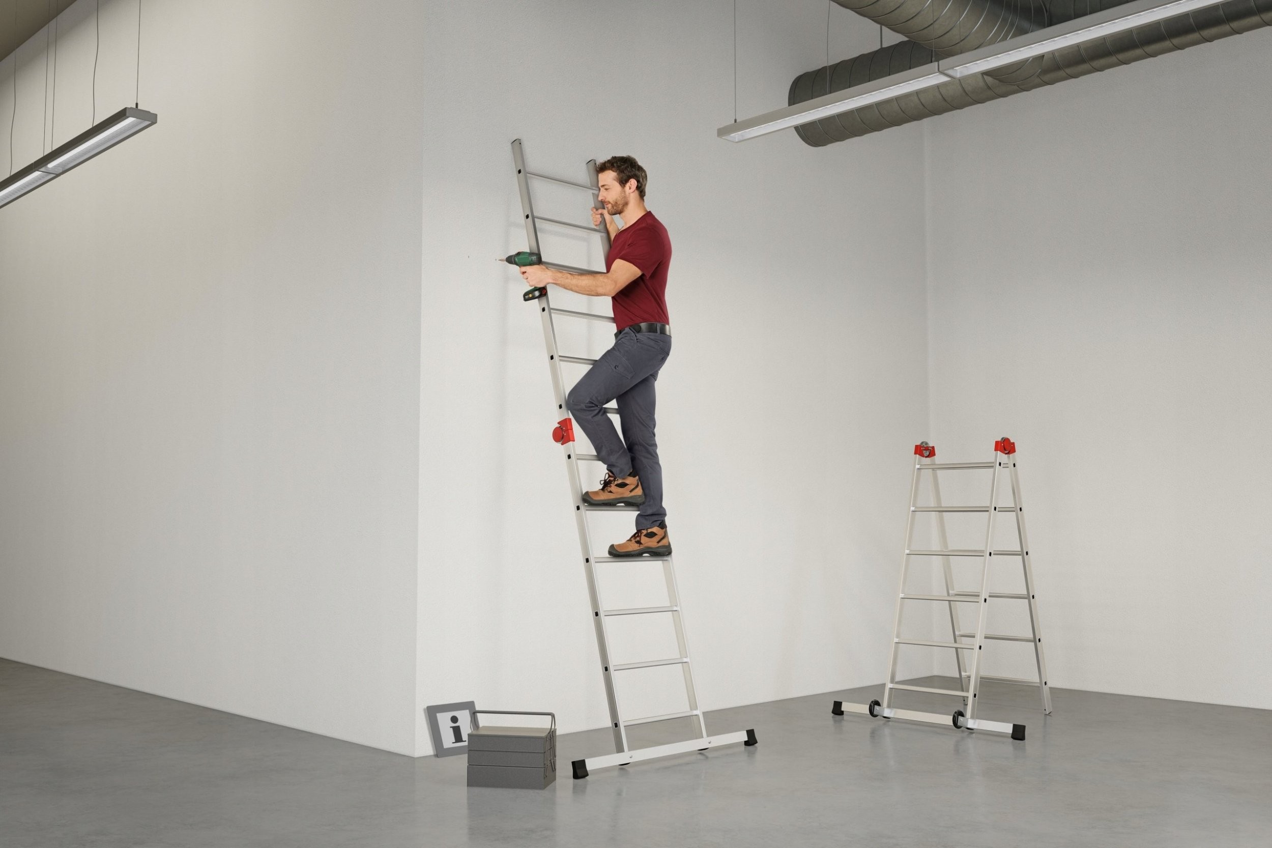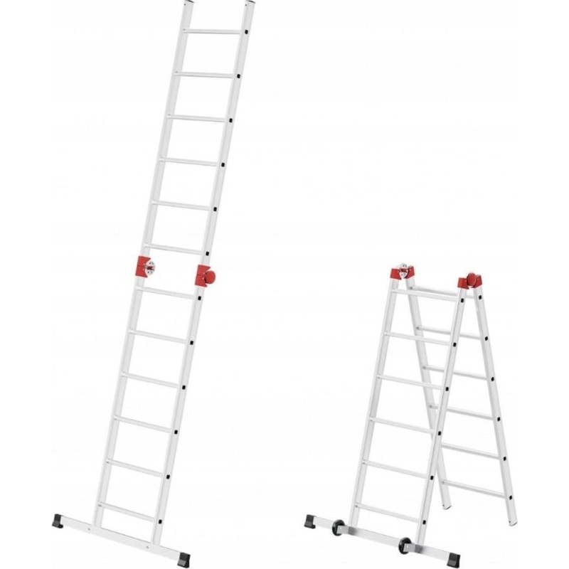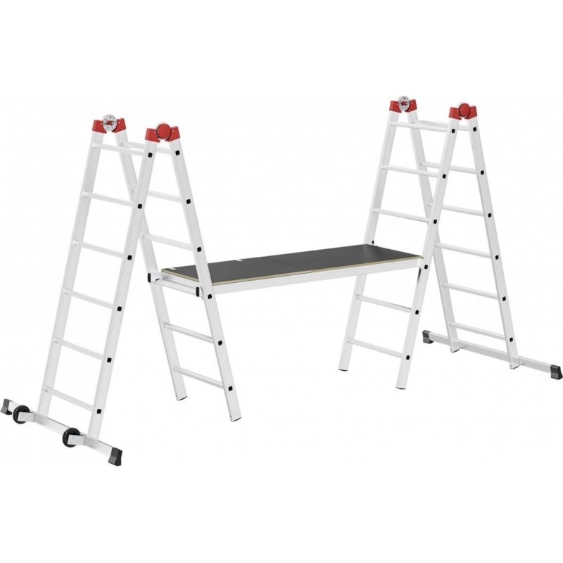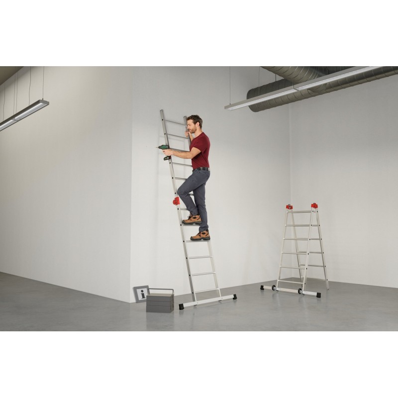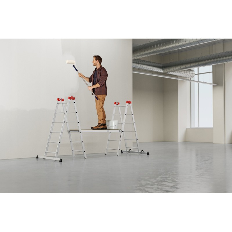 - Multifunkcyjność: zastosowanie jako pojedyncza i podwójna drabina, jako małe rusztowanie do użytku wewnętrznego i zewnętrznego lub jako platforma robocza