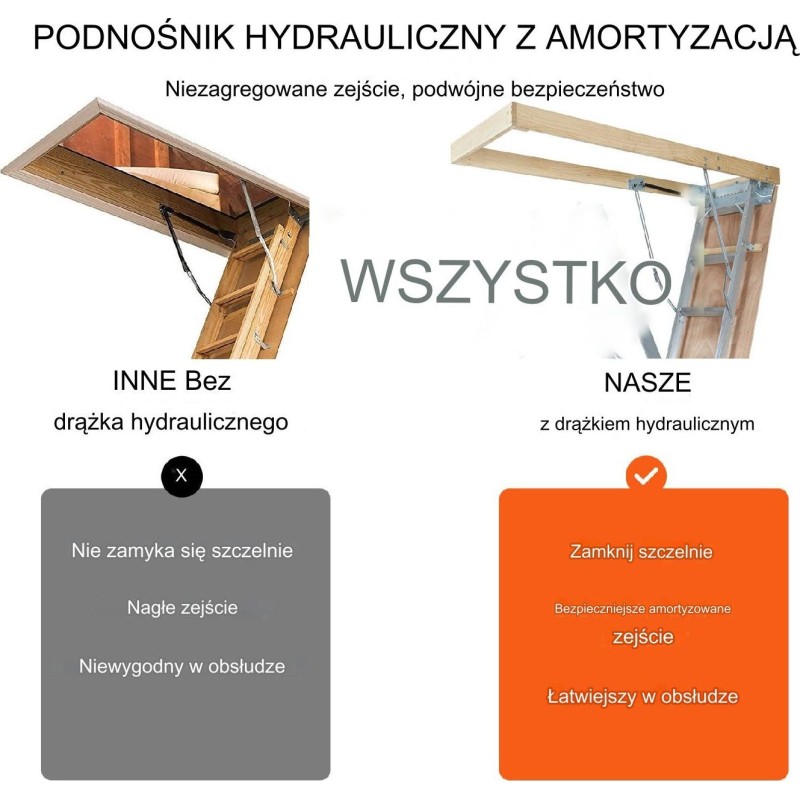 Bezpieczne i amortyzowane zejście: Wyposażone w specjalny hydrauliczny mechanizm, który zapobiega nagłym upadkom i wypadkom oraz zapewnia kontrolowane zejście, zapewniające bezpieczeństwo Twojej rodziny. Po zamknięciu drabina idealnie się układa, nie pozostawiając żadnych szczelin i zachowując dyskretny wygląd.
