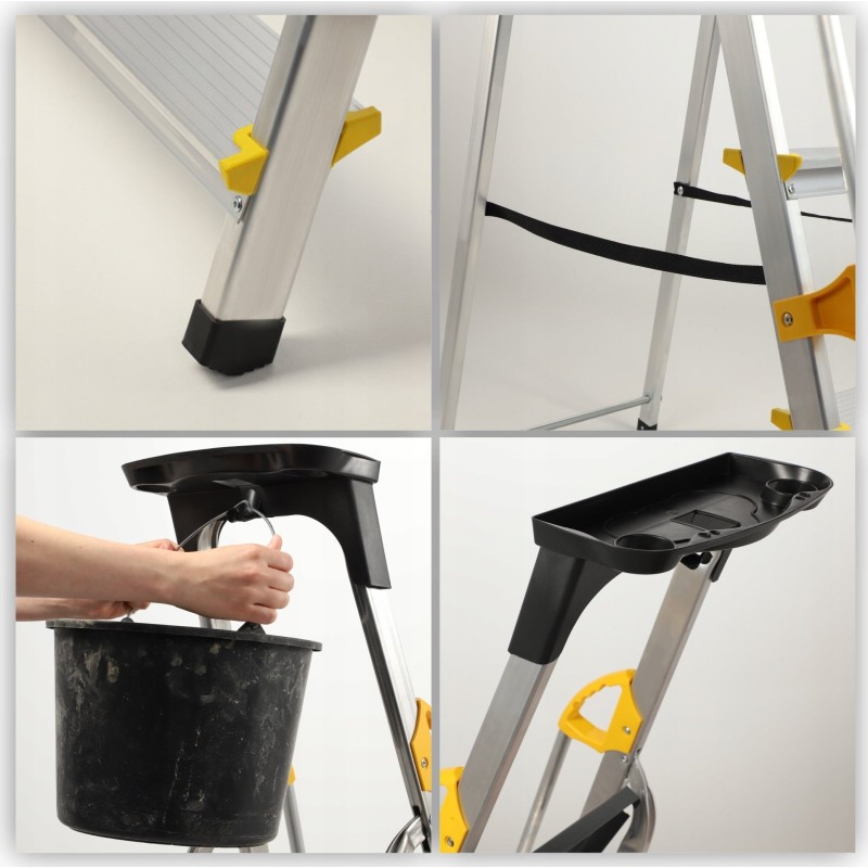 Wysoka nośność do 150 kilogramów oznacza, że z łatwością wniesiesz na drabinę, np. wiadro z farbą. Co więcej, powiesisz je na specjalnym haku przy półce, która ma udźwig 10 kg.