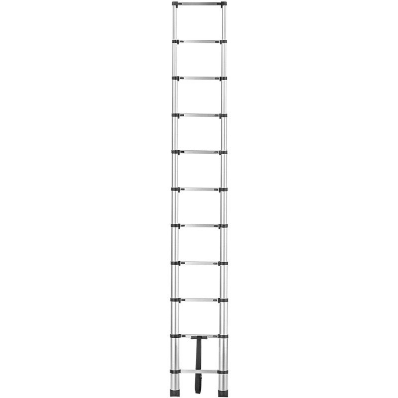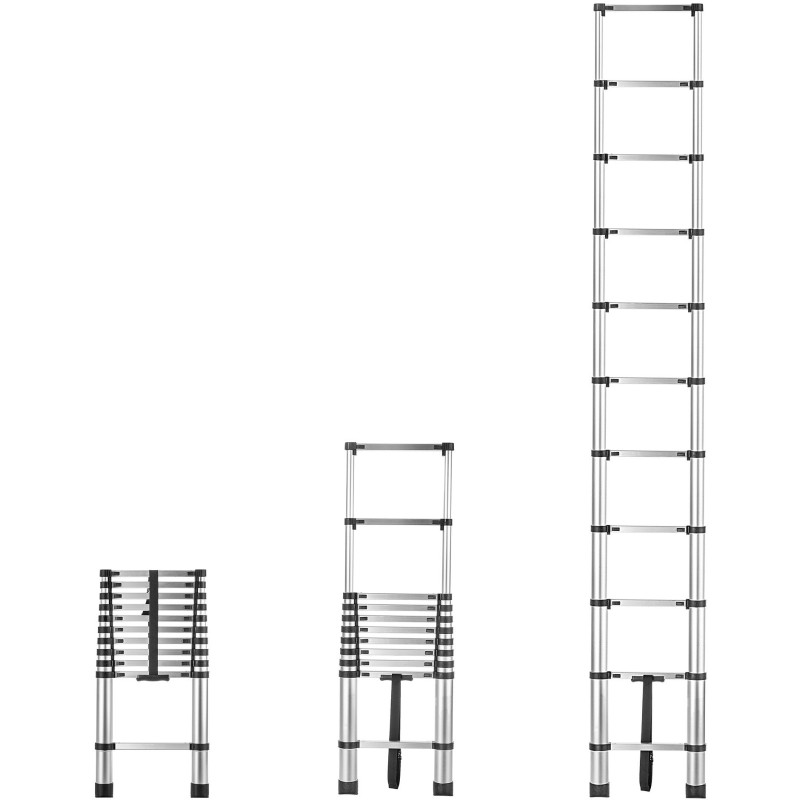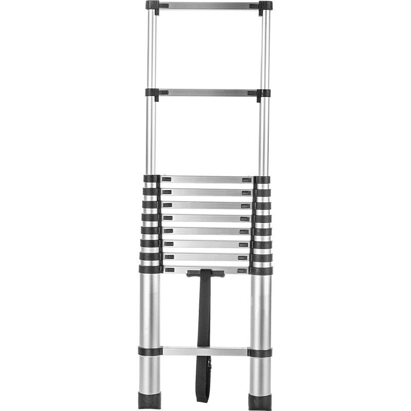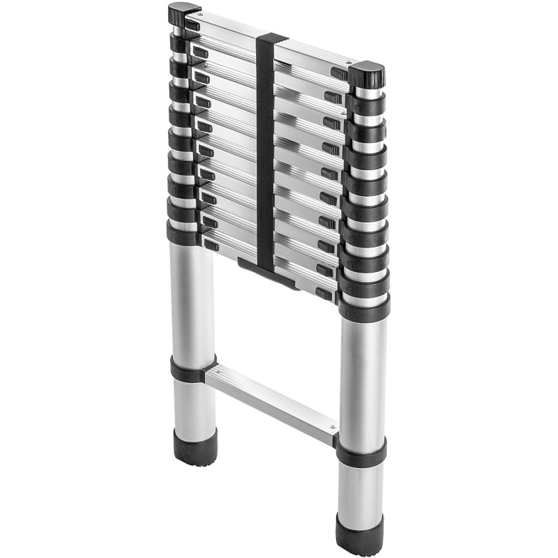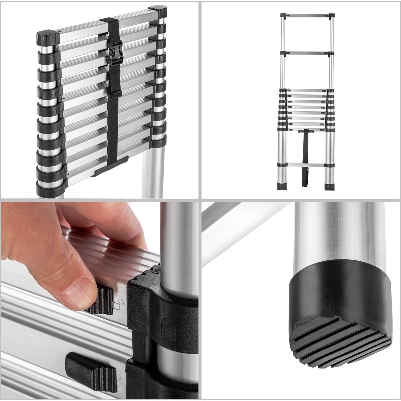 aluminiowa drabina teleskopowa pozwoli Ci bezpieczną realizację zadań wymagających znalezienia się na danej wysokości. Akcesorium wyposażono w szerokie i stabilne stopki antypoślizgowe.