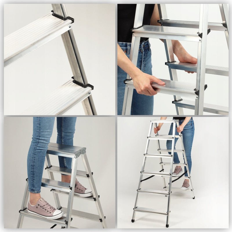 Chcesz wybrać wyższą czy niższą drabinę Możesz swobodnie zdecydować, ponieważ dwustronną drabinę oferujemy w pięciu wersjach: 4, 5, 6, 7 i 8 stopni.