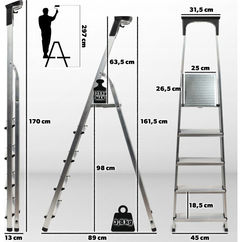 - Wymiary drabiny po rozłożeniu: 45 x 89 x 161,5 cm