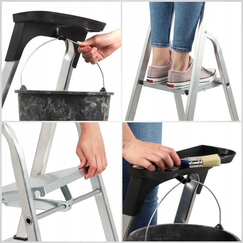 Narzędzie wykonane jest z trwałego i lekkiego aluminium, dlatego nie będziesz mieć problemów z zabieraniem go w podróż. Nasza drabina aluminiowa dzięki kompaktowym rozmiarom łatwo zmieści się w bagażniku samochodowym, garażu lub schowku na narzędzia.