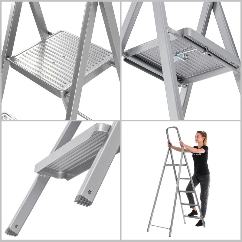 Ergonomiczna, składana drabina to akcesorium, które będzie niezbędne w każdym domu. Oferowany przez markę Kadax stalowy produkt Servey jest propozycją, która spełni oczekiwania nawet najbardziej wymagających użytkowników – możesz wybrać spośród 4 różnych wariantów, różniących się ilością stopni, a co za tym idzie, wysokością. Najmniejszy model ma 3 stopnie i 124 centymetry wysokości, następnie – 4 stopnie, 147 centymetrów, 5 stopni i 170 centymetrów oraz 6 stopni, 193 centymetry wysokości