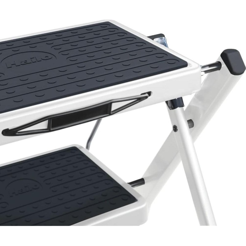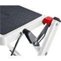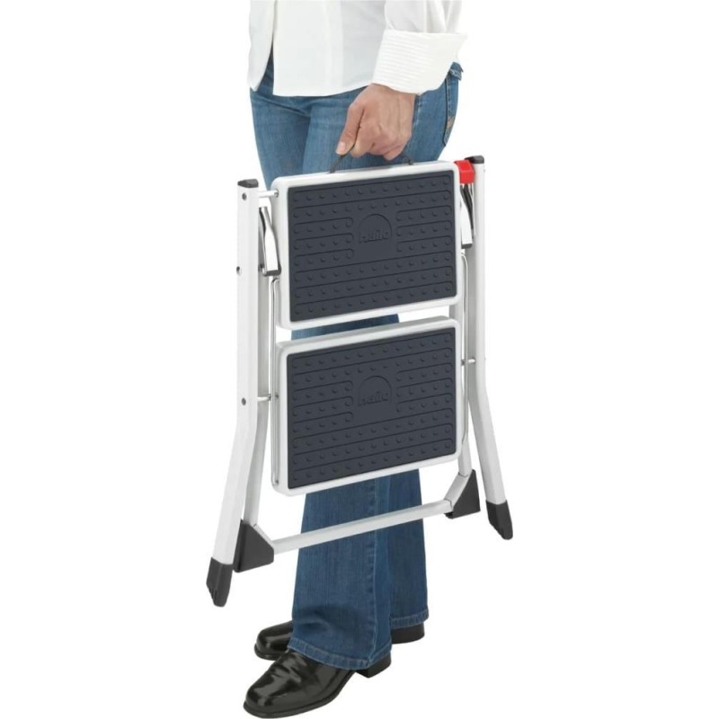 Mała i kompaktowa drabinka posiada 2 duże stopnie z antypoślizgowymi matami i mieści się w każdym rogu. Posiada blokadę zawiasów z przyciskiem zwalniającym. Antypoślizgowe, plastikowe nóżki zapewniają stabilność. Drabinka składa się do zaledwie 4 cm grubości, co ułatwia przechowywanie, gdy nie jest używana. Jest również bardzo wygodna w przenoszeniu dzięki praktycznemu uchwytowi do przenoszenia.