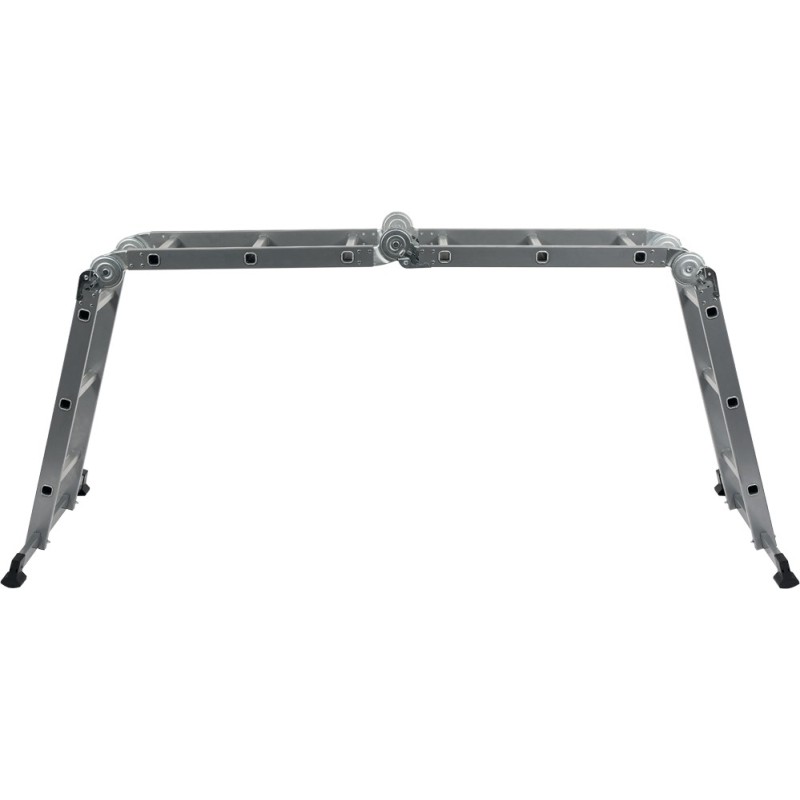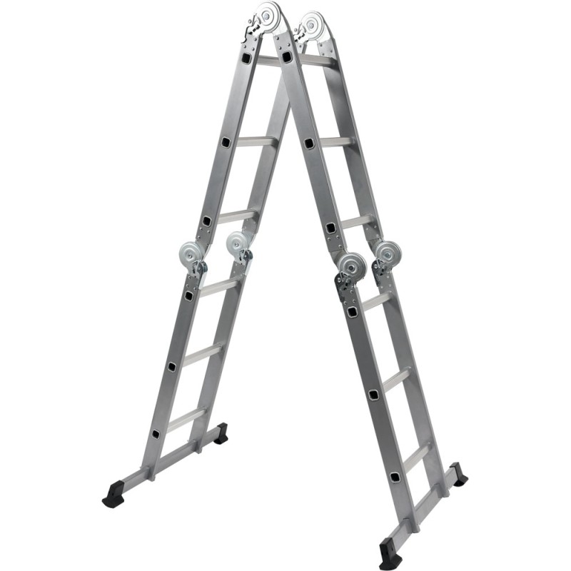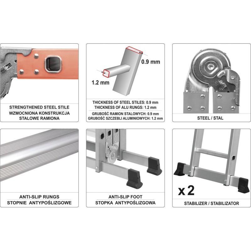 Drabina wielofunkcyjna 4x3 o wysokości max 3,4m. Spełnia wymogi normy europejskiej PN EN131 o nośności na stopień 150kg. Składa się z czterech segmentów połączonych mocnymi i wytrzymałymi przegubami. Wszystkie przeguby posiadają zamki ryglowe, umożliwiające bardzo szybką i wygodną zmianę ustawień drabiny w zależności od potrzeb. Podłużnice wykonane są ze wzmacnianych profili stalowych o grubości 0,9mm, które są znacznie mocniejsze od aluminiowych. Wpływa to na znacznie zwiększenie stabilności i bezpieczeństwa oraz wydłuża żywotność drabiny. Szczeble aluminiowe zrobione są z profili o grubości 1,2mm, które z każdej strony posiadają profilowane antypoślizgowe powierzchnie. Ponadto drabina zakończona jest dwoma szerokimi stabilizatorami znacznie zwiększającymi stabilność i bezpieczeństwo podczas użytkowania. Każdy stabilizator posiada dwie wyprofilowane stopki antypoślizgowe, które zwiększają przyczepność do podłoża w każdej pozycji rozłożenia drabiny.