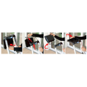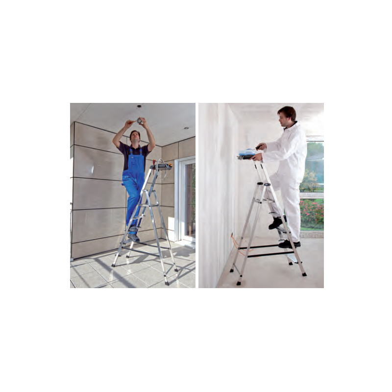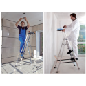 - Kompaktowa drabina aluminiowa z obszernym rozkładanym pojemnikiem ograniczającym konieczność wielokrotnego wchodzenia/schodzenia z drabiny podczas pracy.