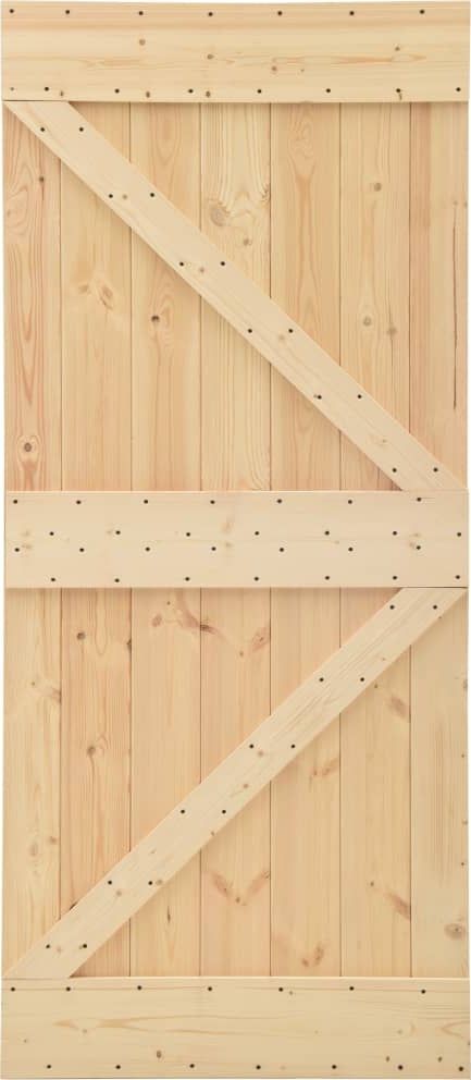 Drzwi wykonano z litego drewna sosnowego, dzięki czemu są niezwykle stabilne i trwałe. Ich naturalna powierzchnia pozwala na ozdobienie ich lub pomalowanie zgodnie z własnymi preferencjami. Przesyłka obejmuje również osprzęt do drzwi przesuwnych, który ułatwia montaż. Akcesoria z malowanej proszkowo stali zwiększają jeszcze wytrzymałość konstrukcji.