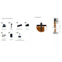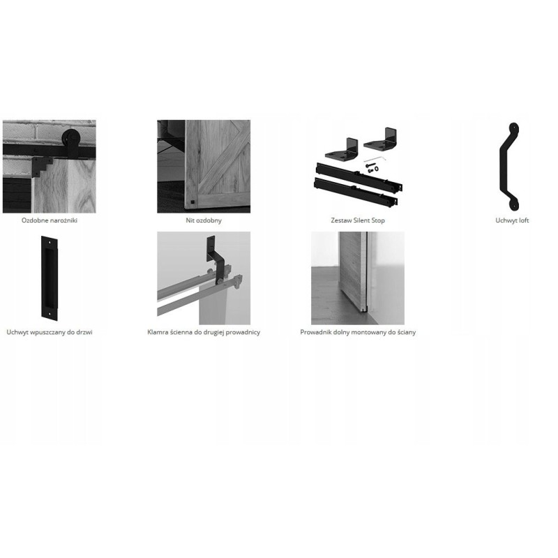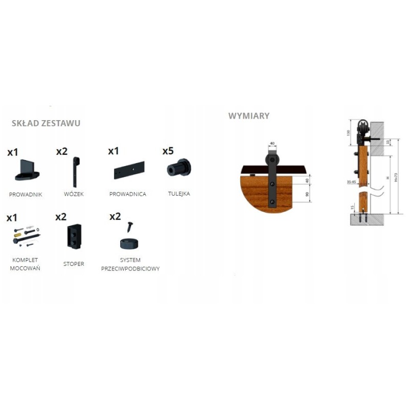 W skład systemu wchodzą wszystkie niezbędne elementy montażowe, takie jak prowadnica, łożyskowane wózki jezdne, tuleje dystansowe oraz akcesoria do montażu w betonie i drewnie. Dodatkowo, dostępne są akcesoria zwiększające komfort użytkowania, takie jak domykacz czy uchwyt wpuszczany, co pozwala na różnorodne konfiguracje.