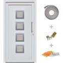 Kolor: biały Materiał: rama drzwi z PVC + wypełnienie przekładkowe Grubość wypełnienia: 24 mm Wymiary: 108 x 208 cm (szer. x wys.) Wymiary okienka: 21 x 21 cm (dł. x szer.) Ościeżnica i skrzydło drzwi o grubości 70 mm Pełny rdzeń stalowy w skrzydle i ościeżnicy Większe bezpieczeństwo dzięki 5-punktowemu ryglowaniu z trzpieniami grzybkowymi Wyposażone w 22-milimetrowy, aluminiowy próg Regulowane zawiasy 3D (3 na każde drzwi) Cztery bezpieczne okienka z obramowaniem ze stali nierdzewnej Szyby odporne na wysoką temperaturę - ISO 4-12-4 Współczynnik przenikania ciepła przez drzwi: 1,4 W/mK; współczynnik przenikania ciepła przez szybę: 1,1 W/mK Zamek po prawej stronie, otwierane do wewnątrz Przesyłka obejmuje drzwi, zestaw uchwytów, wkładkę patentową, 3 klucze, taśmę uszczelniającą i zestaw montażowy Zestaw uchwytów: Wewnętrzny uchwyt ze stali nierdzewnej Wkładka patentowa z 3 kluczami Zewnętrzny uchwyt ze stali nierdzewnej, 350 mm Zawiera 2 rozety Zestaw montażowy: Zawiera 6 metalowych kołków, 6 kotew ściennych, 8 plastikowych klinów, 6 nakładek Długość kołka: 152 mm Taśma uszczelniająca: Sprasowana pianka 8 m w rolce