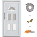 Kolor: biały Materiał: rama drzwi z PVC + wypełnienie przekładkowe Grubość wypełnienia: 24 mm Wymiary: 98 x 208 cm (szer. x wys.) Wymiary okienka: górne 44 x 20 cm (dł. x szer.), dolne 36 x 14,5 cm (dł. x szer.) Ościeżnica i skrzydło drzwi o grubości 70 mm Pełny rdzeń stalowy w skrzydle i ościeżnicy Większe bezpieczeństwo dzięki 5-punktowemu ryglowaniu z trzpieniami grzybkowymi Wyposażone w 22-milimetrowy, aluminiowy próg Regulowane zawiasy 3D (3 na każde drzwi) Szyby odporne na wysoką temperaturę - ISO 4-12-4 Współczynnik przenikania ciepła przez drzwi: 1,4 W/mK; współczynnik przenikania ciepła przez szybę: 1,1 W/mK Zestaw uchwytów: Wewnętrzny uchwyt ze stali nierdzewnej Wkładka patentowa z 3 kluczami Zewnętrzny uchwyt ze stali nierdzewnej, 350 mm Zawiera 2 rozety Zestaw montażowy: Zawiera 6 metalowych kołków, 6 kotew ściennych, 8 plastikowych klinów, 6 nakładek Długość kołka: 152 mm Taśma uszczelniająca: Sprasowana pianka 8 m w rolce