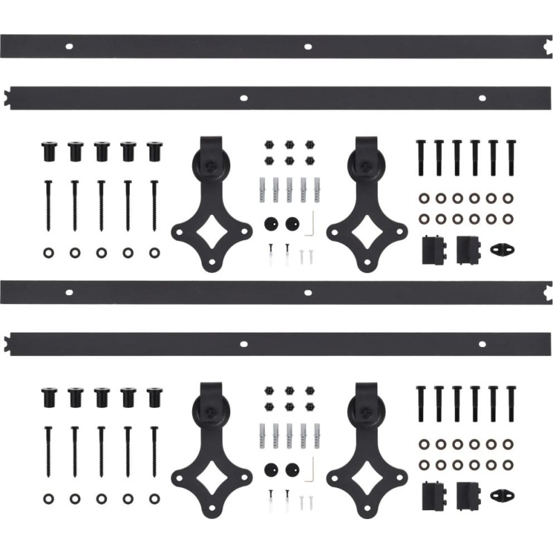 Przesyłka obejmuje 4 prowadnice ślizgowe, 4 rolki, 4 ograniczniki, 2 prowadnice podłogowe, 4 antyskoki, 10 zacisków mocujących i inny potrzebny sprzęt. Uwaga: Drzwi nie są częścią zestawu.