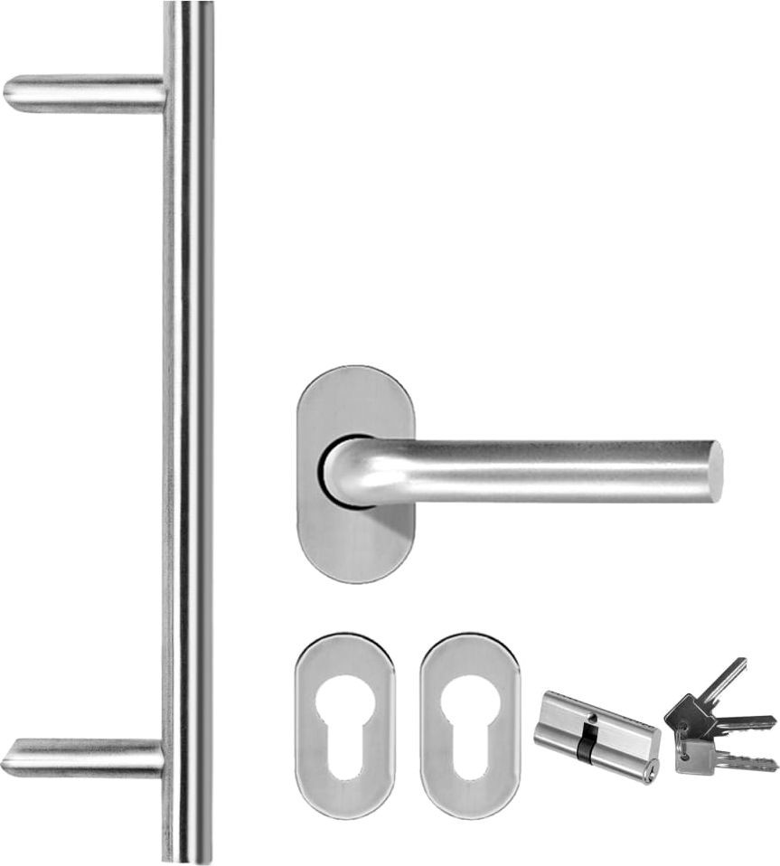 Otrzymasz cały komplet, obejmujący również uchwyt zewnętrzny ze stali nierdzewnej, uchwyt wewnętrzny, a także wkładkę patentową, klucze, taśmę uszczelniającą i zestaw montażowy.