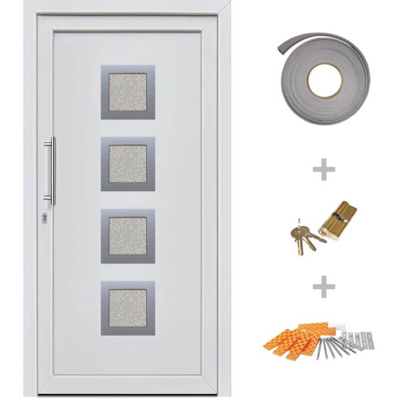 - Przesyłka obejmuje drzwi, zestaw uchwytów, wkładkę patentową, 3 klucze, taśmę uszczelniającą i zestaw montażowy