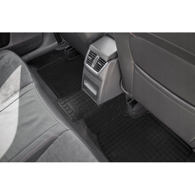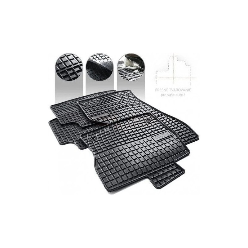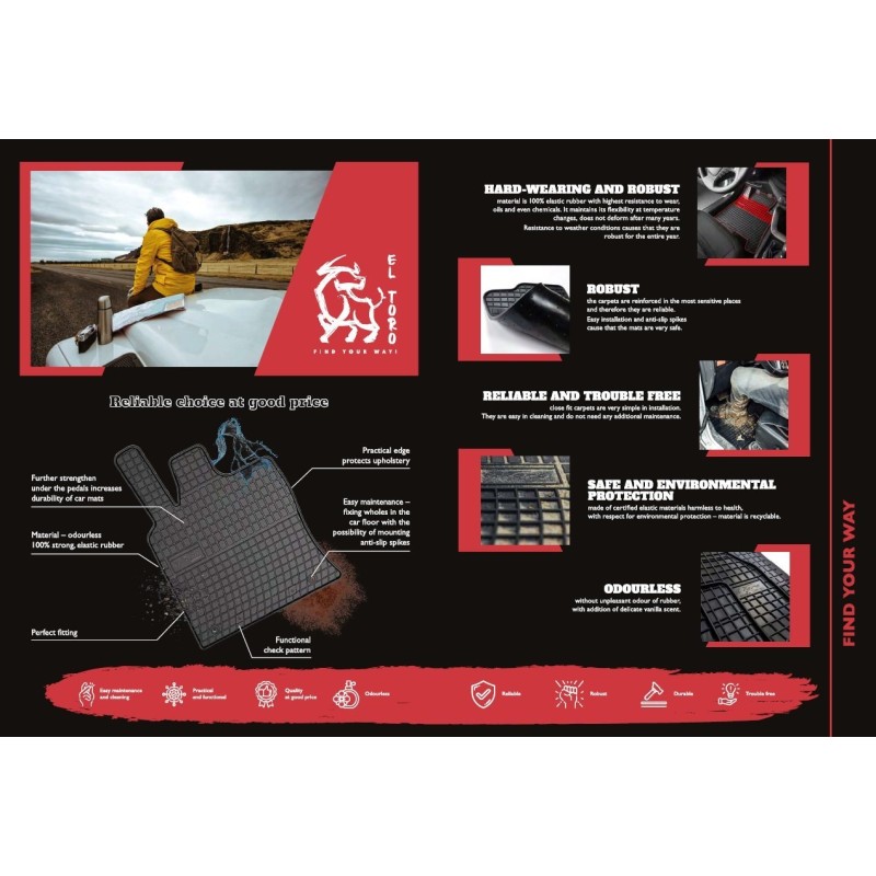 Oferowane maty zostały starannie skonstruowane do formy podłogi uwzględniając nie tylko markę i model pojazdu, ale także rocznik oraz w uzasadnionych sytuacjach wersję nadwozia. Maty produkowane są z najwyższej klasy, wytrzymałej i wzmocnionej mieszanki gumowej, która nie zawiera substancji niebezpiecznych dla zdrowia, co gwarantuje bezpieczne użytkowanie. Elegancki kołnierz (brzeg) ochronny wokół mat skutecznie zatrzymuje wodę oraz zanieczyszczenia, ochraniając oryginalną tapicerkę pojazdu przed zabrudzeniem. Maty od spodu mają zaprojektowane drobne kolce, które dodatkowo zapobiegają ich przesuwaniu. Mata kierowcy została dodatkowo wzmocniona w kluczowym miejscu (w miejscu kontaktu pięty z podłożem maty) aby chronić ją przed przetarciem.