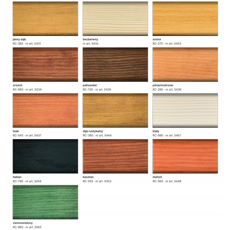 Lasura ta jest odporna na niekorzystne warunki atmosferyczne oraz promieniowanie UV, co zapewnia długotrwałą ochronę drewna. Dzięki tym właściwościom, drewno zachowuje swój naturalny wygląd i nie ulega degradacji pod wpływem czynników zewnętrznych.