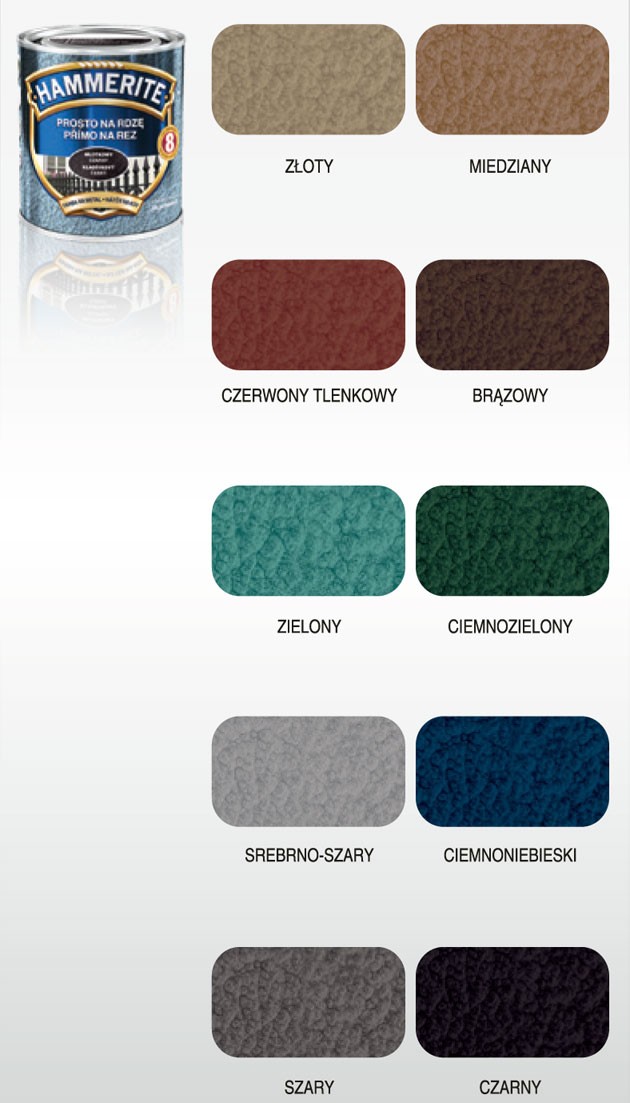 Hammerite Prosto na Rdzę jest jednoskładnikową farbą schnącą na powietrzu, przeznaczoną do antykorozyjnego i dekoracyjnego malowania metali żelaznych (stal, żeliwo), zarówno tych pokrytych rdzą, jak i czystych. Może być również stosowana do zabezpieczenia metali nieżelaznych po odpowiednim zagruntowaniu.