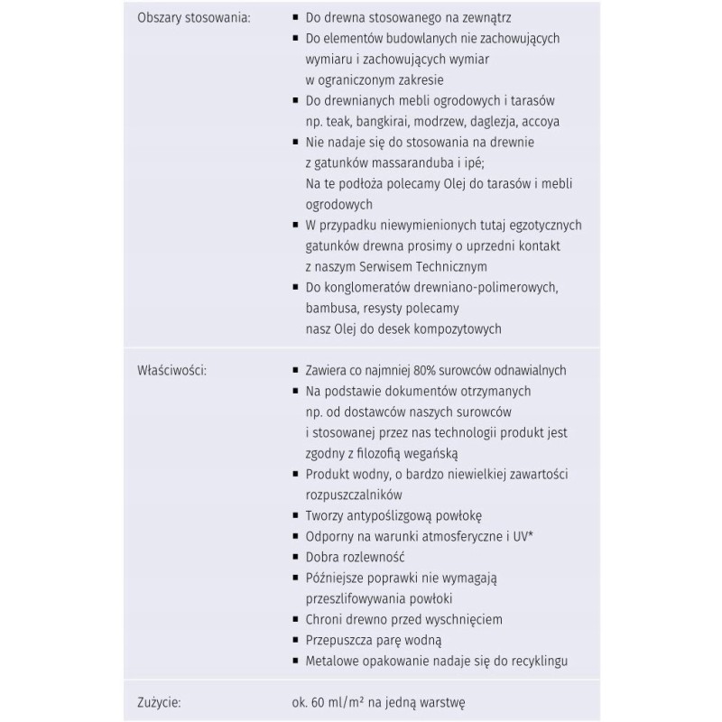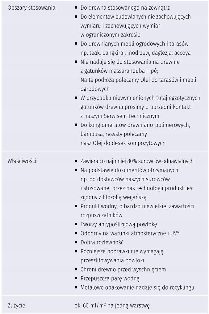 Produkt jest przeznaczony do aplikacji na drewnie, w tym na meblach ogrodowych oraz tarasach. Dzięki swojej formule, olej skutecznie zabezpiecza drewno przed niekorzystnym wpływem warunków atmosferycznych.