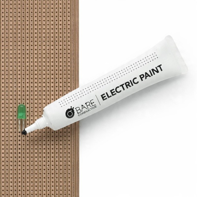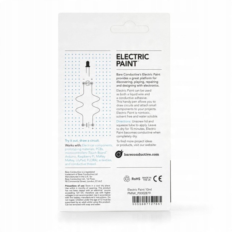 Bare Conductive Electric Paint to rewolucyjna farba, która przewodzi prąd elektryczny, dostępna w wygodnej tubie o pojemności 10 ml. Dzięki niej masz możliwość tworzenia interaktywnych projektów, malując ścieżki elektryczne na różnych powierzchniach.