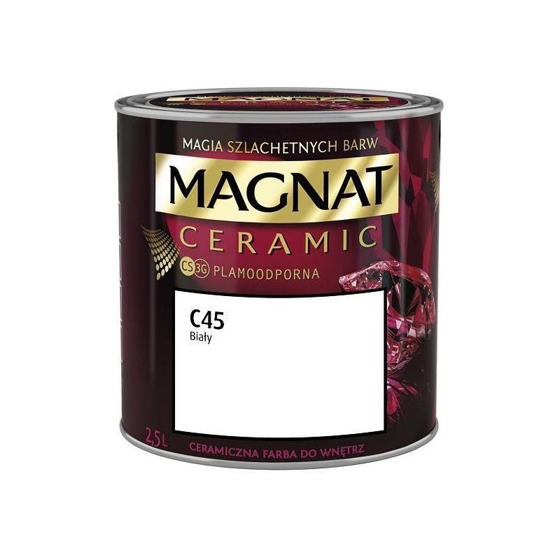MAGNAT CERAMIC CS 3G, ceramiczna farba do wnętrz, trzeciej generacji, wyprodukowana przy wykorzystaniu innowacyjnej technologii CERAMIC SYSTEM bazującej na ceramicznych komponentach oraz najwyższej jakości żywicach i pigmentach. Ta unikalna formuła zapewnia farbie MAGNAT ponadprzeciętne parametry odporności na szorowanie i wielokrotne zmywanie oraz sprawia, że powłoki farby nie absorbują zabrudzeń i „trudnych” plam oraz są odporne na dezynfektanty.