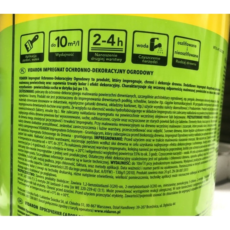 Impregnat Ogrodowy Vidaron to wszechstronny produkt ochronno-dekoracyjny, który skutecznie impregnuje, chroni i ozdabia drewno. Dzięki swojej formule, zapewnia długotrwałą ochronę powierzchni, utrzymując intensywny kolor i efekt dekoracyjny przez długi czas.