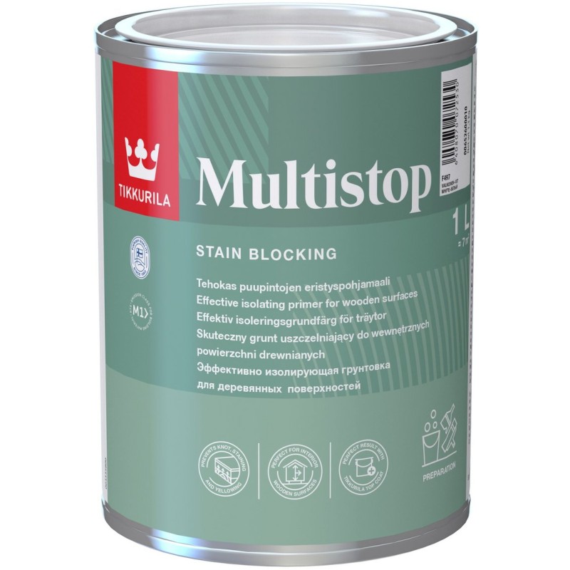 Tikkurila PRIMER MULTISTOP WHITE F497 to matowy grunt blokujący, który doskonale sprawdzi się na różnych drewnianych powierzchniach wewnętrznych. Dzięki swojej formule na bazie wody, jest idealnym rozwiązaniem zarówno dla nowych, jak i wcześniej malowanych powierzchni, takich jak panele ścienne, sufitowe, podłogi, drzwi oraz okna.