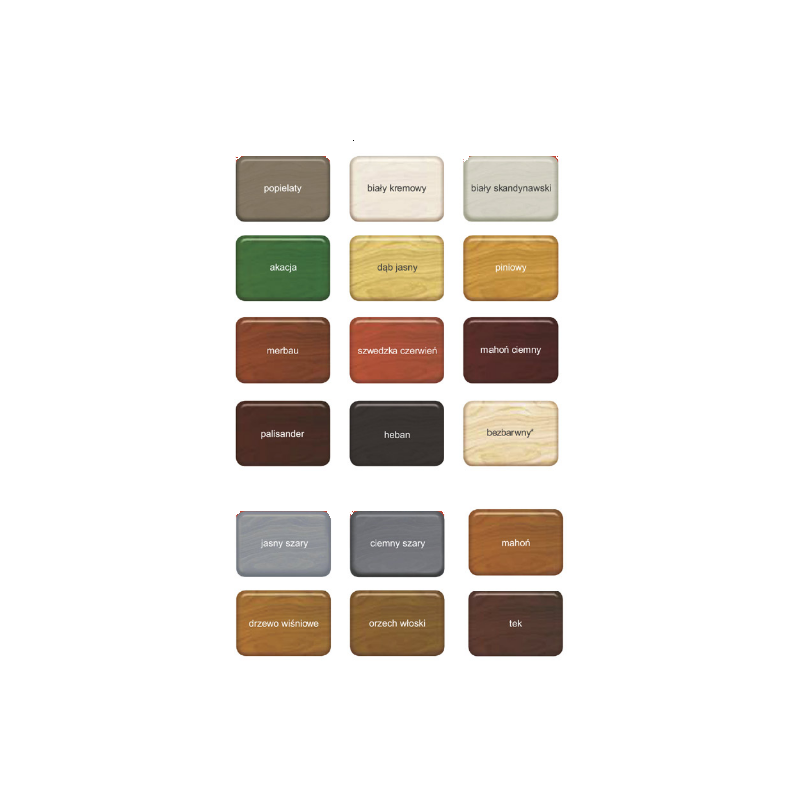 - dla kolorów: piniowy2, dąb jasny 57, drzewo wiśniowe 88, mahoń 7, biały kremowy 99, kukurydza 94, orzech włoski 4, biały skandynawski oraz w przypadku kolorów rozjaśnionych za pomocą Sadolin Extra bezbarwny (dotyczy wszystkich kolorów)
