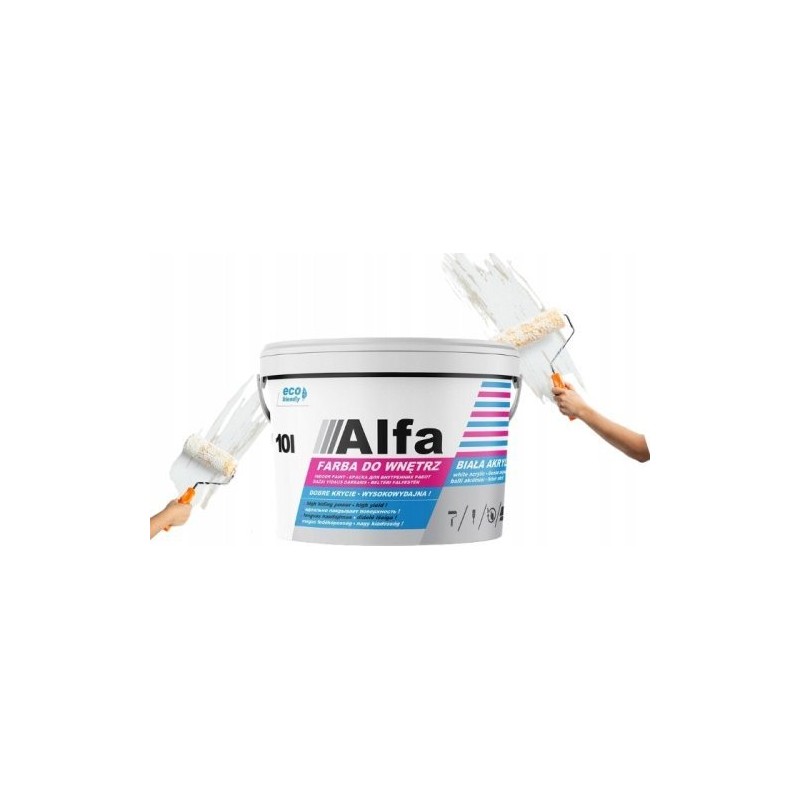 Alfa to farba akrylowa wodorozcieńczalna, stworzona do malowania sufitów i ścian wewnątrz pomieszczeń. Wykazuje doskonałe krycie, wysoką jakość i matowe wykończenie powierzchni. Farba jest niezwykle łatwa w użyciu i ma bardzo korzystny stosunek ceny do jakości. Produkt nie zawiera rozpuszczalników i nie ma intensywnego zapachu.