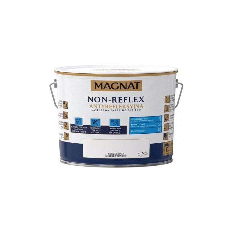 Farba lateksowa MAGNAT Non Reflex 10 l Magnat MAGNAT NonReflex to biała, głęboko matowa farba do sufitów. Jej specjalna receptura umożliwia wykonywanie poprawek bez powstawania smug, a pochłaniająca świetlne refleksy powłoka optycznie wyrównuje pomalowane podłoże. Odporność na zmywanie i szorowanie oraz odporność na działanie UV/UVC pomagają zachować na dłużej efekt bieli i wrażenie świeżo odmalowanego sufitu. Farba cechuje się także zmniejszonym przywieraniem kurzu oraz odpornością powłoki na rozwój pleśni i grzybów, co wpływa na lepszą jakość i komfort życia domowników. Właściwośc MAGNAT Non Reflex: Powłoka odporna na rozwój grzybów i pleśni Miejscowe poprawki bez smug Trwała biel odporna na UV/UVC Antyrefleksyjna - optycznie wyrównane podłoże Jednolity mat niezależnie od kąta padania światła Brak Smużenia - Antystatyczna - zmniejszone przywieranie kurzu Odporna na zmywanie i szorowanie Komfortowe malowanie Nie chlapie podczas malowania Doskonałe krycie Wydajność z opakowania przy jednokrotnym malowaniu (2.5L 30m²; 10L 120m²)