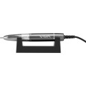 Cicha praca frezarki sprawia, że jest ona komfortowa w użyciu, nie zakłócając spokoju osoby wykonującej zabieg ani klientów. W trakcie pracy głowicę bezpiecznie można odłożyć na dołączony do zestawu dedykowany stojak. Wydajny akumulator dwuogniskowy o pojemności 2000 mAh, w który wyposażone jest urządzenie, pozwala na nieprzerwaną pracę przez nawet 8-10 godzin na jednym ładowaniu. Do zestawu dołączony jest praktyczny ceramiczny frez w kształcie stożka, który zapewnia wszechstronność zastosowań i ułatwia wykonanie różnorodnych zabiegów.