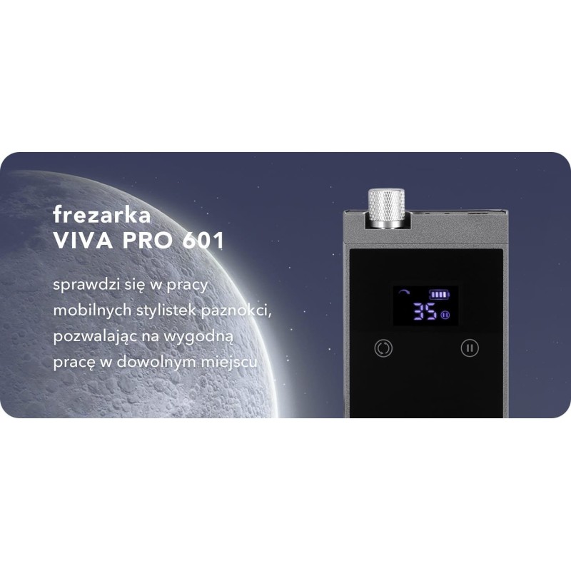 Kompaktowa frezarka akumulatorowa VIVA PRO 601 to profesjonalne urządzenie, które doskonale sprawdzi się w pracy mobilnych stylistek paznokci, pozwalając na wygodną pracę w dowolnym miejscu. Umożliwia sprawne przygotowanie paznokci pod dalsze zabiegi i znacznie ułatwia usuwanie pozostałości poprzednich stylizacji. Pozwala na komfortową pracę nawet do 10 godzin na jednym ładowaniu.