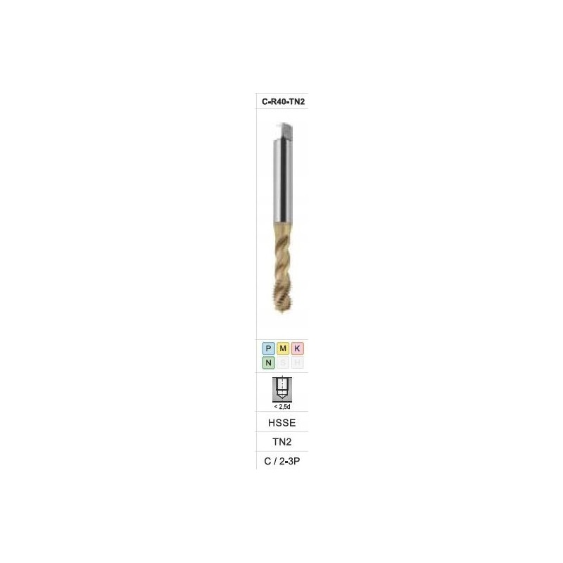 Brak konieczności chłodzenia. Tolerancja średnicy podziałowej: ISO2(6H). Rodzaj rowków wiórowych: R40. Średnica otworu pod gwint: 8,80. Typ gwintu: MF. Kierunek gwintu: RH. Rozmiar gwintu: M10x1,25. Typ otworu: nieprzelotowy. Norma wykonania: DIN-371. Nakrój: C (2-3P). Materiał narzędzia: HSSE. Długość całkowita: 100 mm. Długość robocza: 15 mm. Powłoka: TN2. Średnica chwytu: 8,0. Zastosowanie: P-Stal M-INOX K-Żeliwo N-Metale nieżelazne.