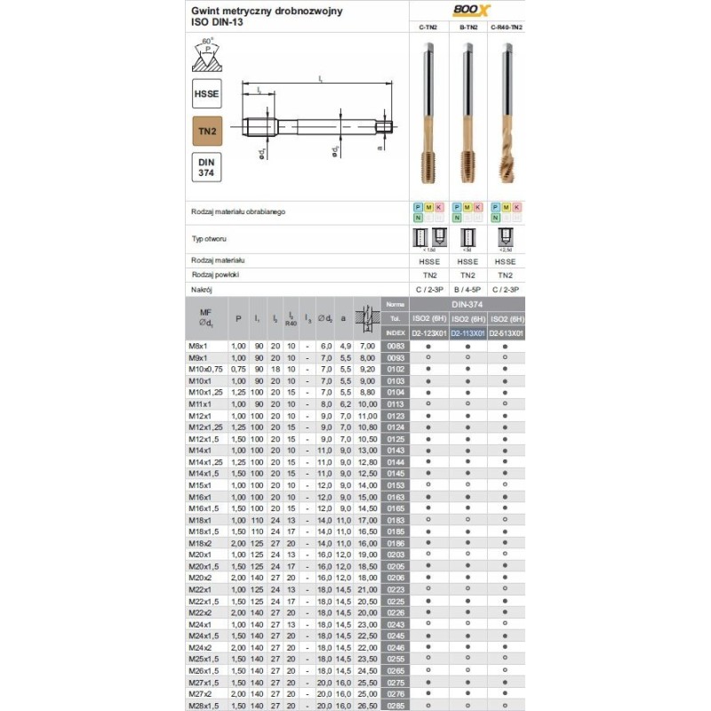 - D2-113X01-0185: Gwintownik 800X M18x1,5-6H DIN-374 B HSSE TN