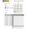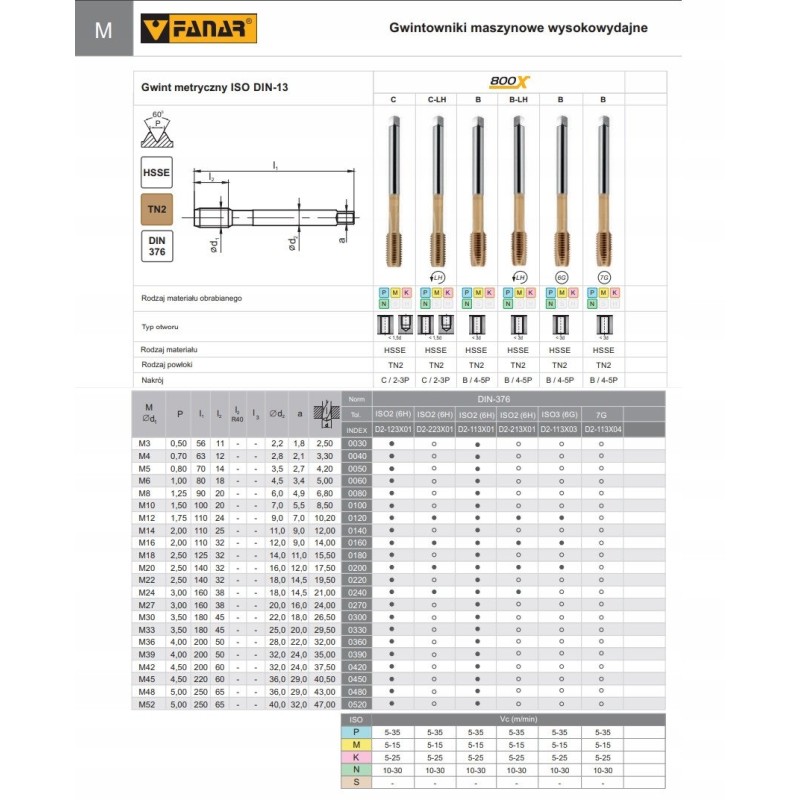 - Cechy: wielowarstwowa powłoka TN, mikrogeometria ostrza, specjalnie zaprojektowane rowki, stal HSSE, chwyt h6, nakrętka B (4-5xP), wykonanie wg DIN-371, DIN-376, DIN-37