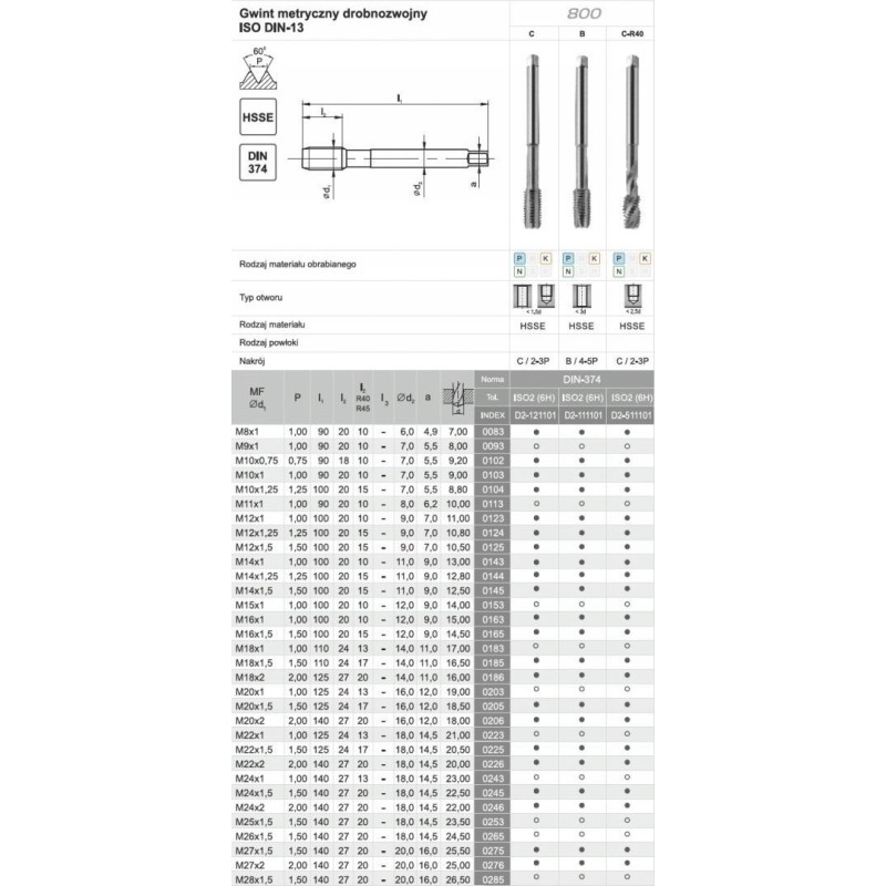 Narzynnik maszynowy wysokowydajny z gwintem metrycznym zwykłym wykonany zgodnie z normą DIN-376B 800 jest przeznaczony do otworów przelotowych. Materiał, z jakiego został zrobiony narzynnik - stal szybkotnąca kobaltowa - charakteryzuje się podwyższoną odpornością termiczną i odpornością na ścieranie. Poddanie obróbce w piecu próżniowym zapewnia wysoką twardość narzędzia przy zachowaniu dobrej ciągliwości. Narzynnik jest idealny do pracy w stali konstrukcyjnej węglowej, automatowej i niskostopowej o wytrzymałości 600MPa