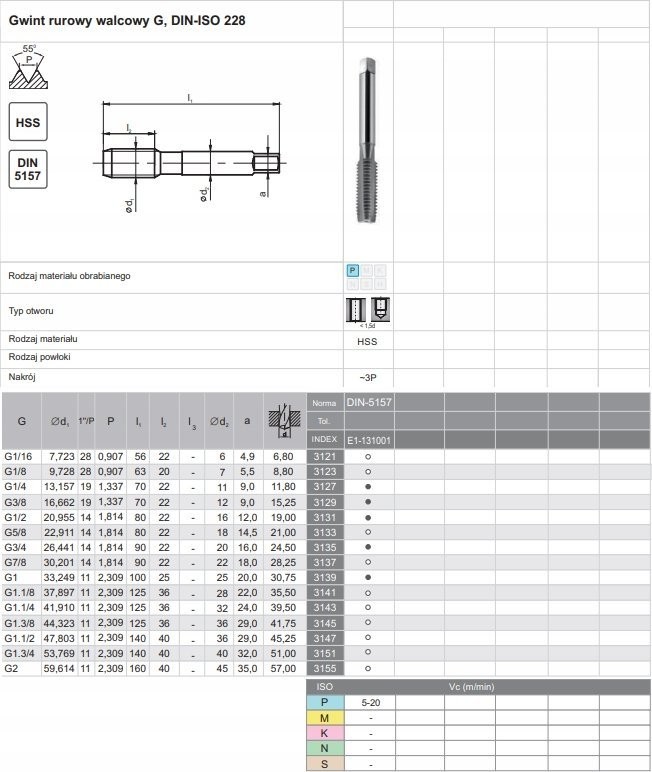 Opróżnianie - brak Tolerancja średnicy podziałowej - Rodzaj rowków wiórowych - Proste d1 - 41,910 P - 2,309 1"/P - 11 l1 - 125 l2 - 36 l3 - d2 - 32 a - 24,0 średnica otworu pod gwint - 39,50