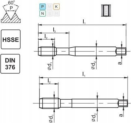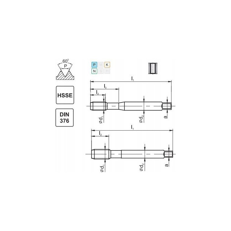 Chłodzenie - brak Tolerancja średnicy podziałowej - 2B Rodzaj rowków wiórowych - Ze skośną powierzchnią natarcia d1 - 19,050 P - 2,540 1"/P - 10 l1 - 125 l2 - 32 l3 - d2 - 14,0 a - 11,0 średnica otworu pod gwint - 16,50