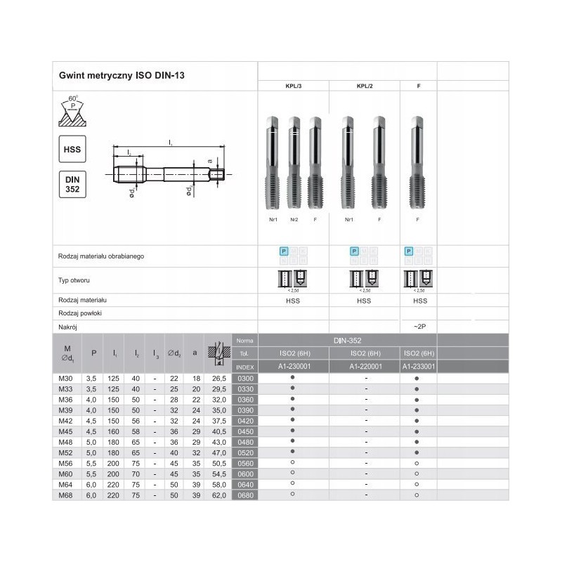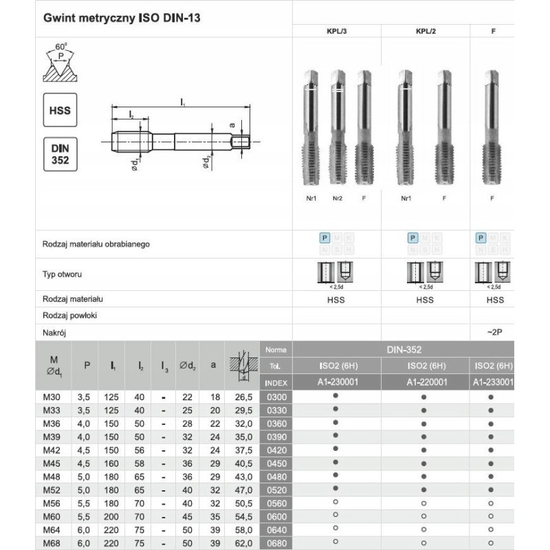 Chłodzenie - brak Tolerancja średnicy - ISO2(6H) Rodzaj rowków wiórowych - nie dotyczy d1 - P - 4,0 1"/P - l1 - 150 l2 - 50 l3 - d2 - 28 a - 22 średnica otworu pod gwint - 32,0 Ilość sztuk w zestawie - 3